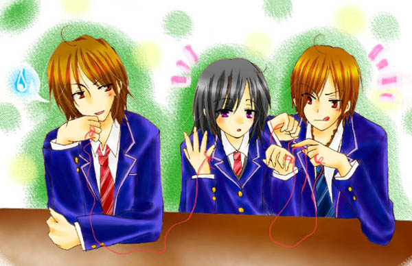 そんな俺の反応に、彰はますますぶすっと顔をゆがめる。そうかと思うと、彼は素早く毛糸玉を奪い(律儀に「野ブタ、俺にも毛糸ちょうだい」と断ってから)、無言で毛糸を切り始めた。そして自分の指に結んで、次は端を隣の野ブタの小指に絡めて……とそこまではよかったが、彼女の指になかなか結べない。